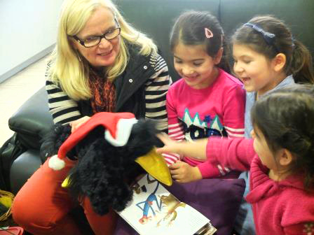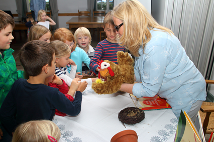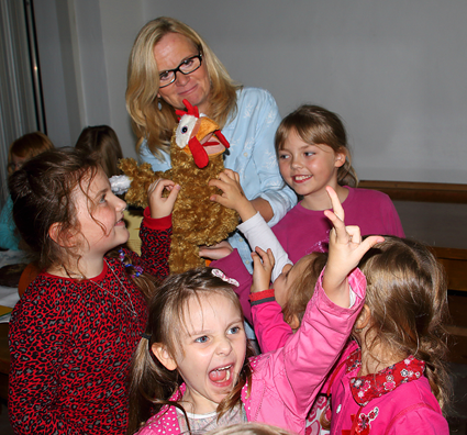 Huhn Henriette genießt sichtlich die Aufmerksamkeit nach der Lesung. Foto: Reinhard Bamming |